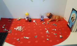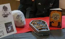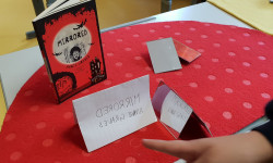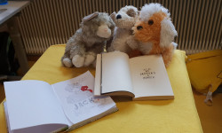 At the end of the project the students presented their books to the class. Each student created a display table with important items from the story. Then the students circulated in the room and listened to each others’ presentations. Here are a few impressions from our presentation session. Click the images to see them in full size.